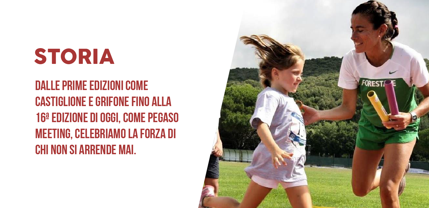 Giunto alla sua sedicesima edizione, il “Pegaso Meeting” rinnova l’appuntamento con la città di Firenze per il secondo anno di fila. Un’evoluzione naturale per un evento nato nel 2003 a Castiglione della Pescaia grazie all’impegno dell’Atletica Castiglionese. Anima della manifestazione resta, oggi come allora, Elisabetta Artuso: già atleta di vertice e 8 volte campionessa italiana degli 800 metri, Elisabetta guida il meeting con la stessa determinazione che l’ha portata ai vertici del mezzofondo azzurro.